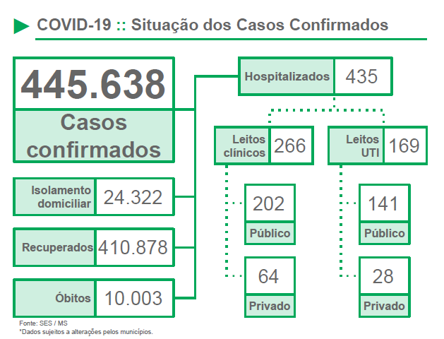 De acordo com o documento os municípios com maior número de novas infecções são Campo Grande (987), Dourados (207), Corumbá (115), Coxim (104) e Sidrolândia (82). A média móvel da última semana no Estado é de 2.498 casos diários.