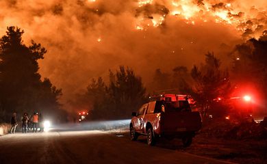 Centenas de bombeiros gregos combatem, pelo segundo dia consecutivo, um grande incêndio florestal nas montanhas Geraneia, a oeste de Atenas. Eles esperam acabar com o fogo graças à melhoria das condições meteorológicas.