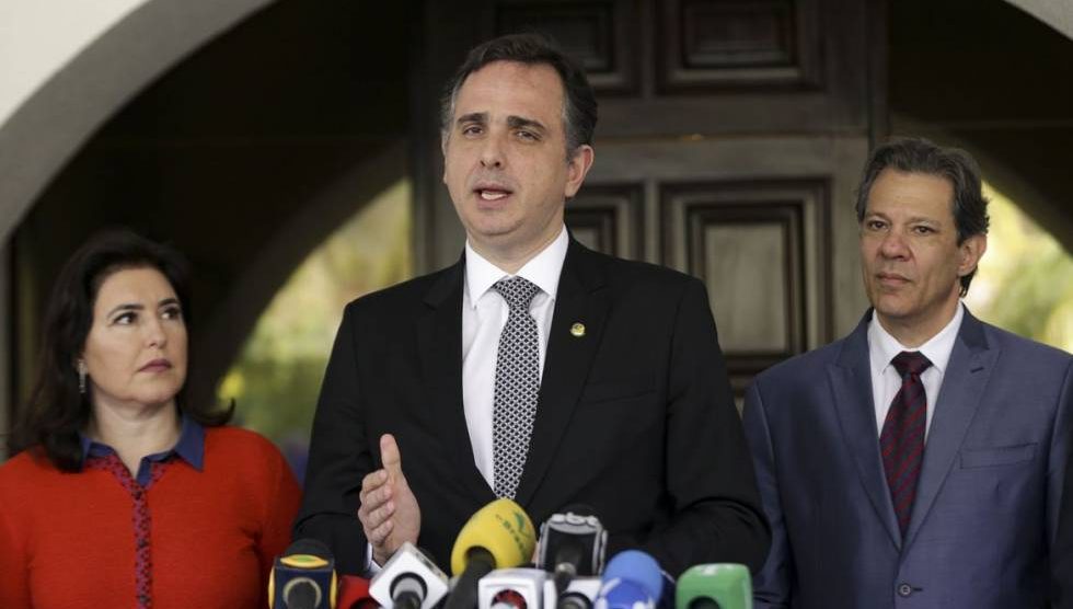Brasília (DF), 11/07/2023 - A ministra do Planejamento, Simone Tebet, o presidente do Senado, Rodrigo Pacheco, e o ministro da Fazenda, Fernando Haddad, durante coletiva após reunião para tratar da tramitação da reforma tributária no Senado. Foto: Marcelo Camargo/Agência Brasil