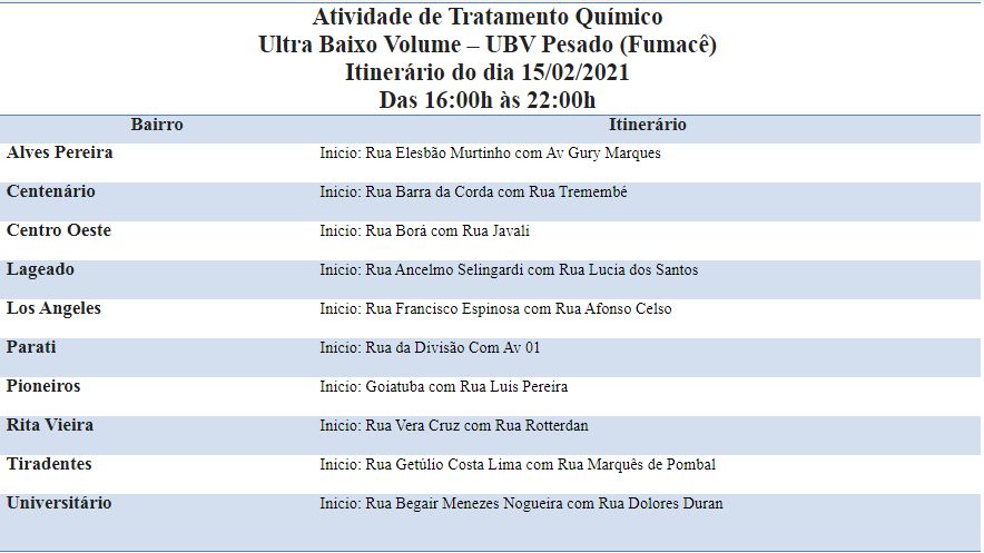 O serviço de borrifação ultra baixo volume (UBV) – conhecido como Fumacê -, usado como ferramenta auxiliar no combate ao mosquito Aedes aegypti, transmissor da dengue, zika e chykungunia, irá percorrer dez bairros nessa segunda-feira (15). As equipes estarão nos bairros Alves Pereira, Jardim Centenário, Jardim Centro Oeste, Lageado, Los Angeles, Parati, Pioneiros, Rita Vieira, Tiradentes e Universitário.