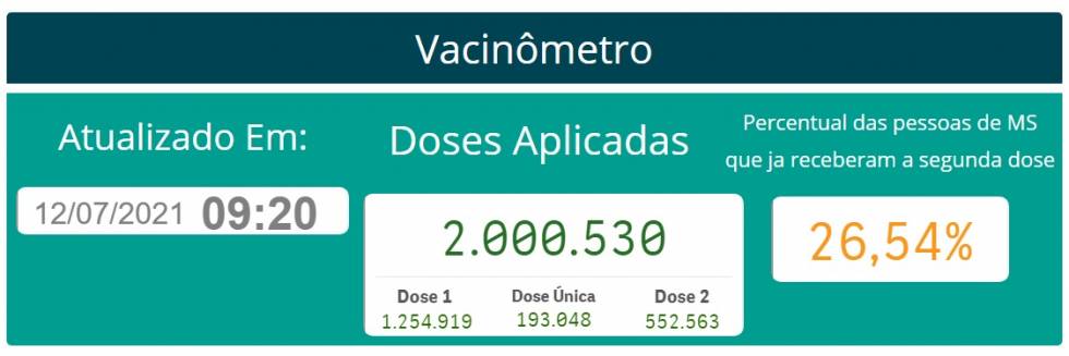 Mato Grosso do Sul ultrapassou a marca de dois milhões de dose aplicadas da vacina contra COVID-19. Foram vacinadas 51,54% da população do Estado com a primeira dose da vacina contra Coronavírus e imunizou 26,54% com as duas doses da vacina.