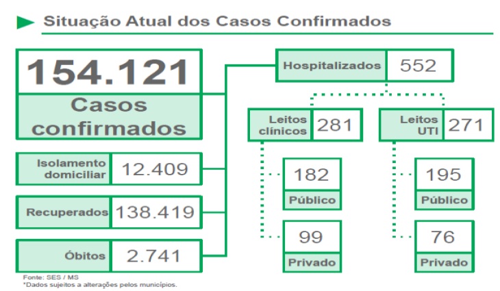 De acordo com o boletim epidemiológico desta quinta-feira (21) em apenas 24 horas mais 1.064 novos casos foram confirmados para a Covid-19. Com isso, o Estado passa a ter 154.121 sul-mato-grossenses que foram infectados pelo vírus.